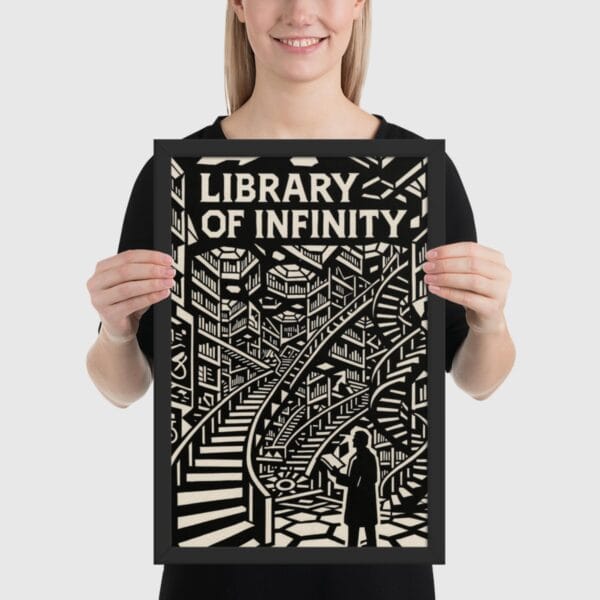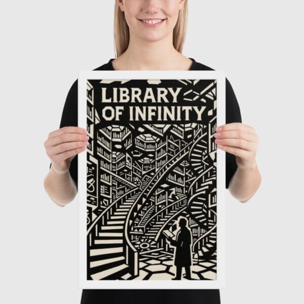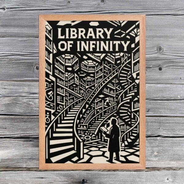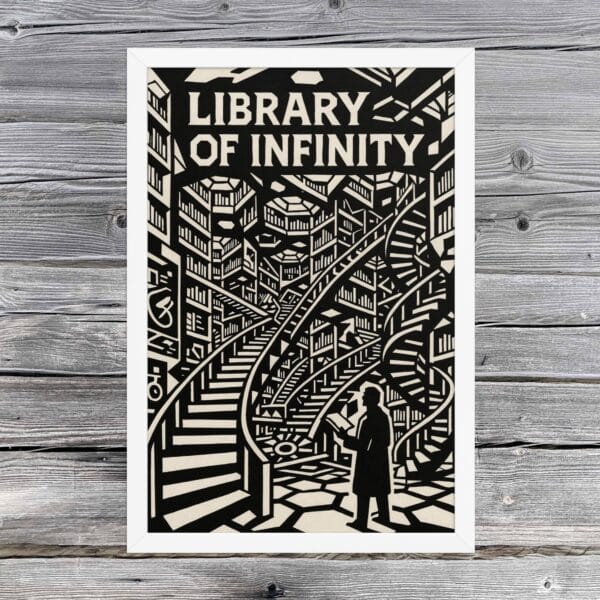 The composition renders books not as mere objects but as architecture itself, the very structure of thought. Angled lines, geometric arcs, and recursive stairways evoke the impossibility of final comprehension, the way each volume gestures toward another in an infinite regress of meaning.